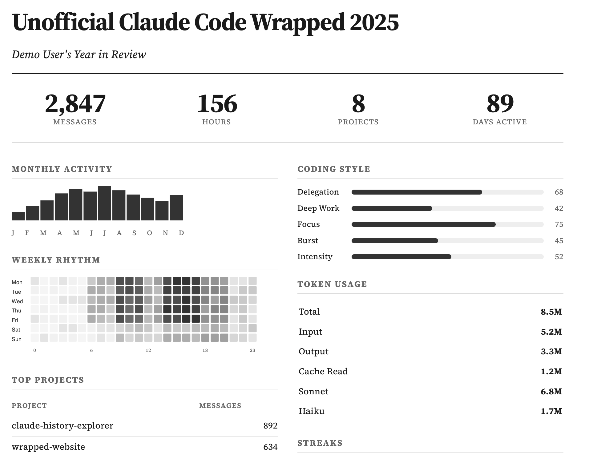 Your year in code with Claude. Generated by Claude History Explorer, a Python CLI tool to explore, search and visualise your Claude Code conversation history.